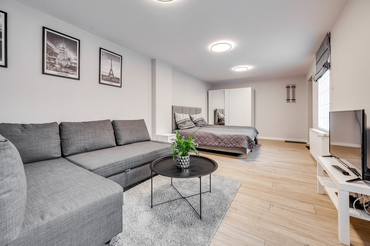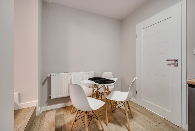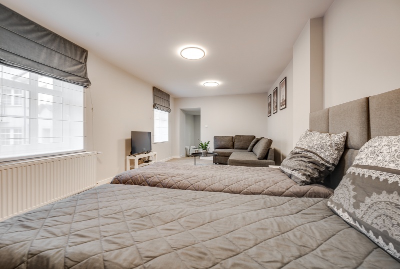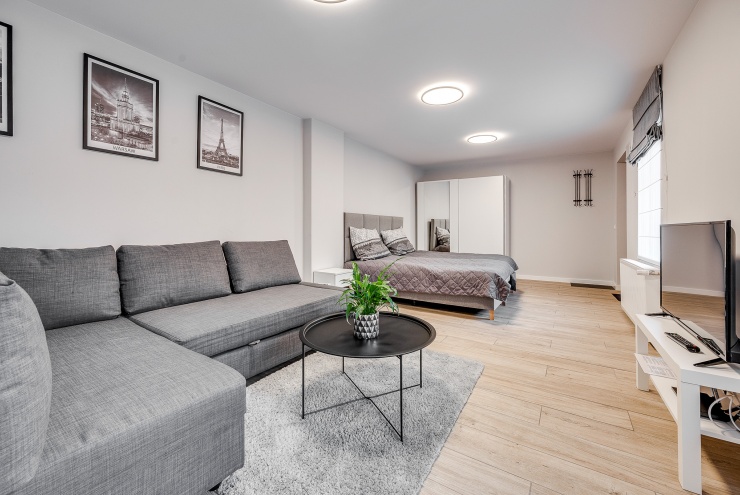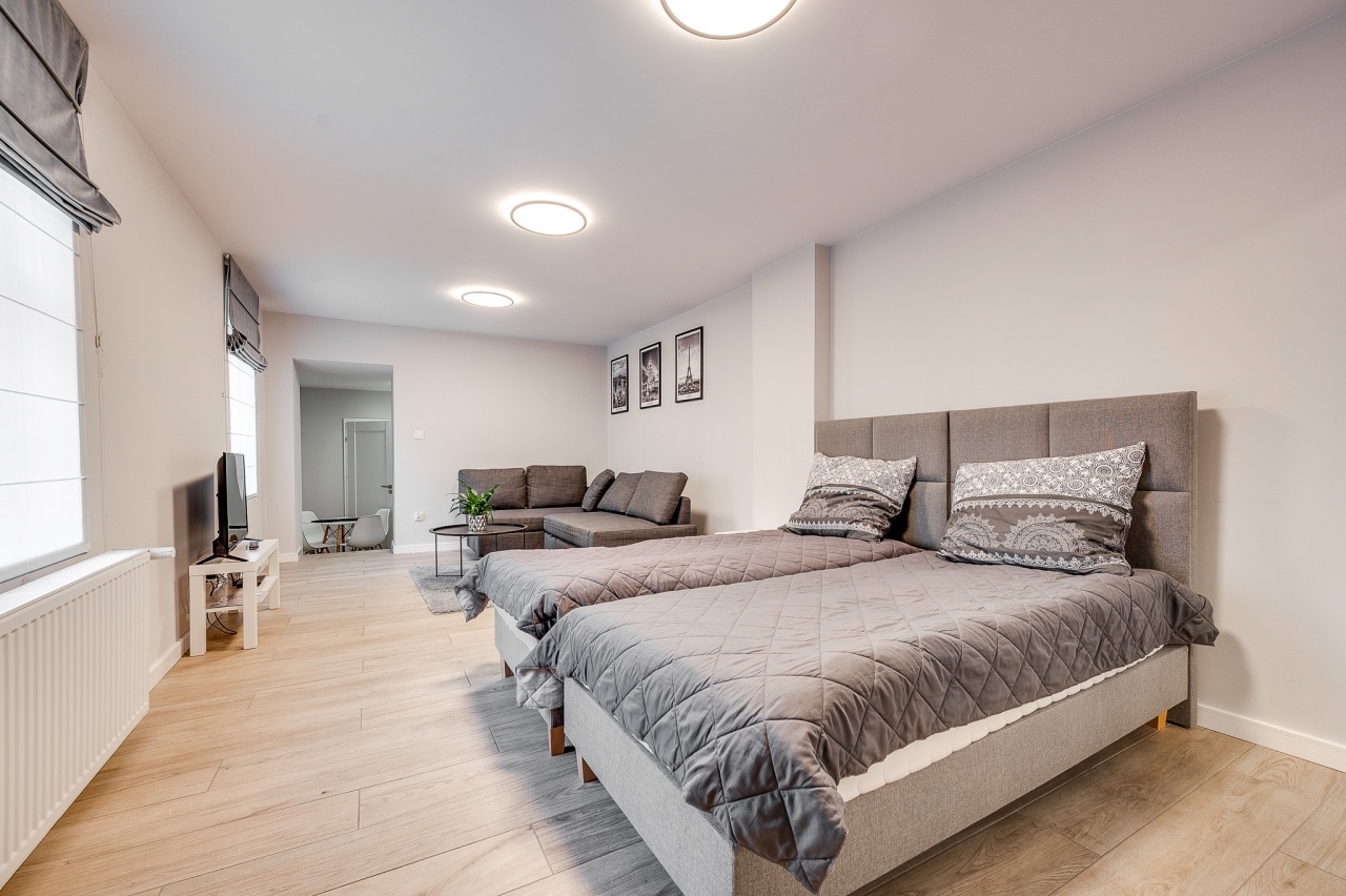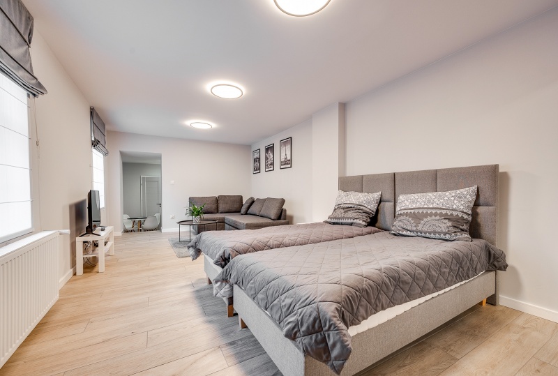 W tym komfortowym i przytulnym apartamencie znajduje się duży salon w którym znajdują się dwa pojedyncze łóżka oraz wygodna rozkładana sofa.Do dyspozycji znajduje się aneks kuchenny w którym znajduje się wszystko co potrzeba (czajnik, piec wraz z piekarnikiem, kuchenka mikrofalowa lodówka, ekspres do kawy)prywatna łazienka wraz z pralką duża szafa. Stół jadalniany z krzesłami dla 4 osób. Do dyspozycji dla Naszych gości przygotowaliśmy komplet ręczników oraz smaczną kawę na czas pobytu