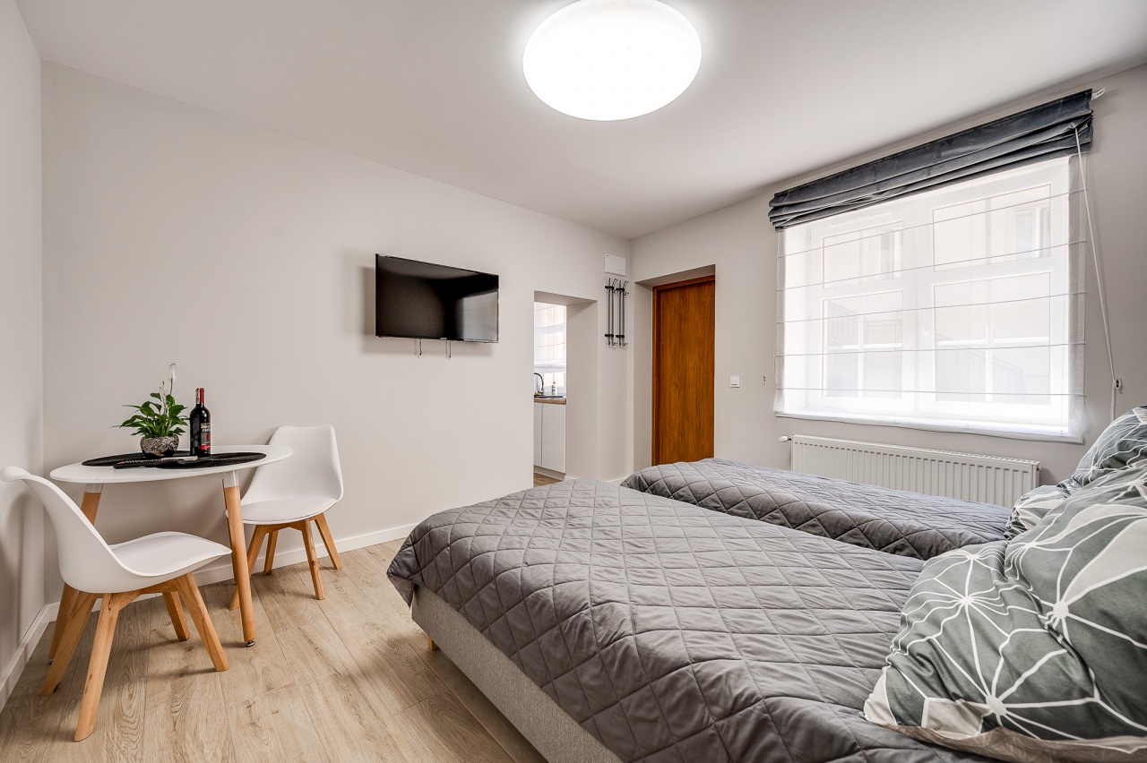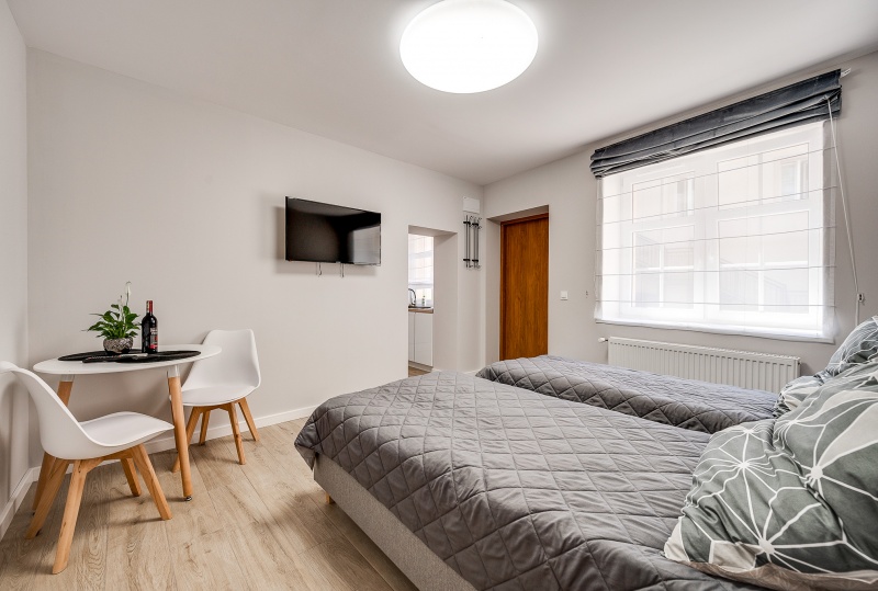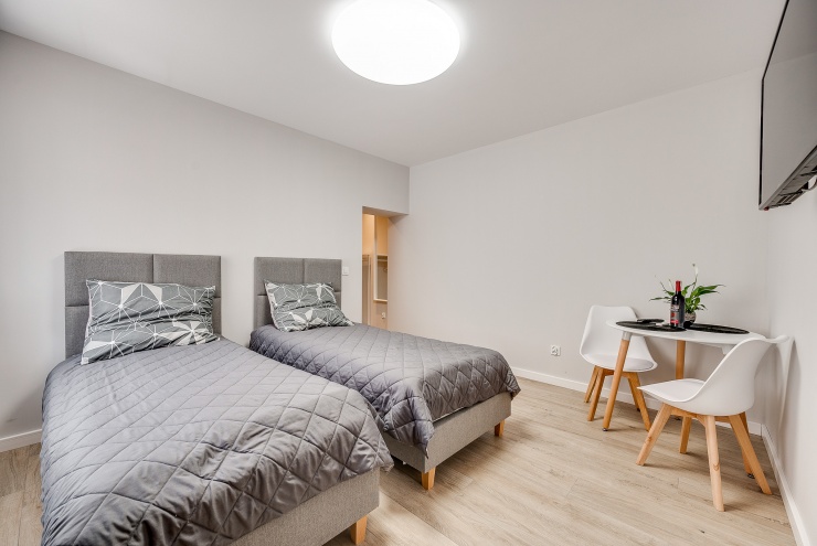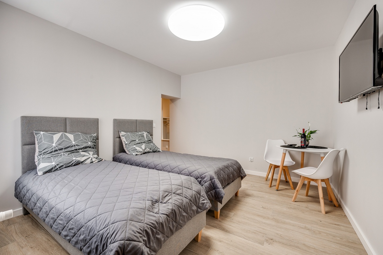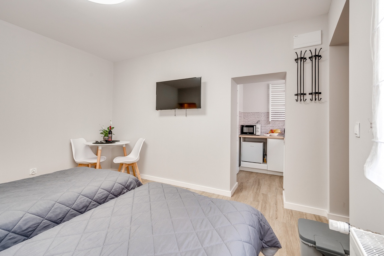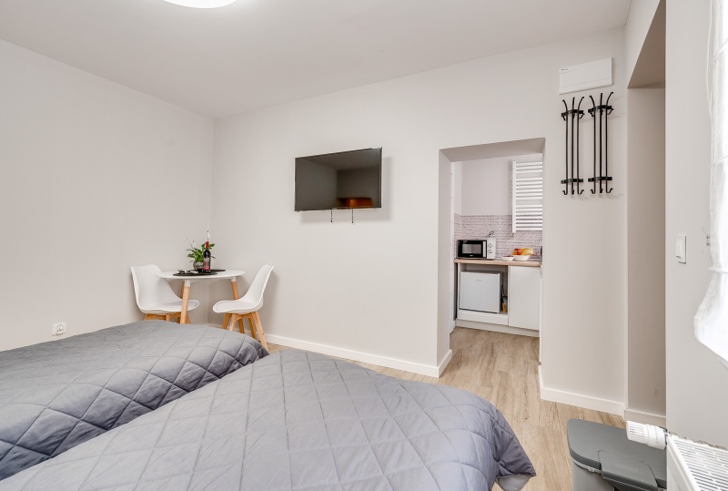 Ten niewielki apartament będzie idealnym miejscem pobytu dla 2 osób. Apartament to wygodna otwarta przestrzeń, w której znajdziemy aneks kuchenny wyposażony w czajnik, kuchenkę mikrofalową, płytę grzewczą i lodówkę, dwa łóżka pojedyncze oraz dużą szafę. Apartament posiada również prywatną łazienkę wyposażoną w pralkę. Do dyspozycji dla Naszych gości przygotowaliśmy komplet ręczników oraz smaczną kawę na czas pobytu