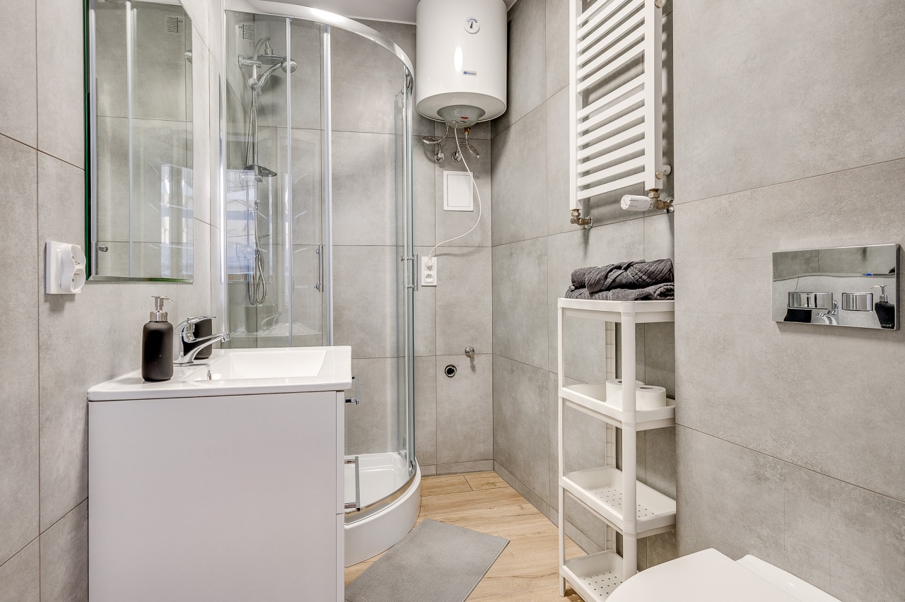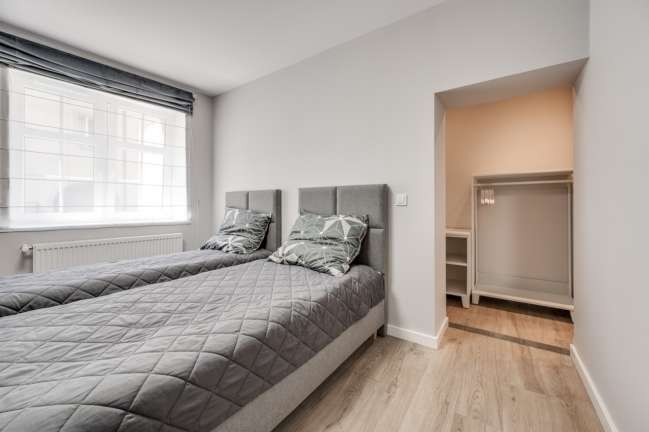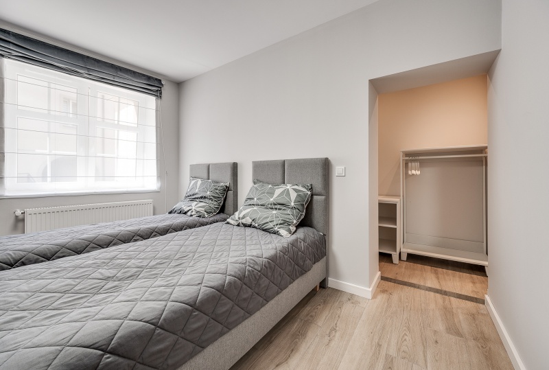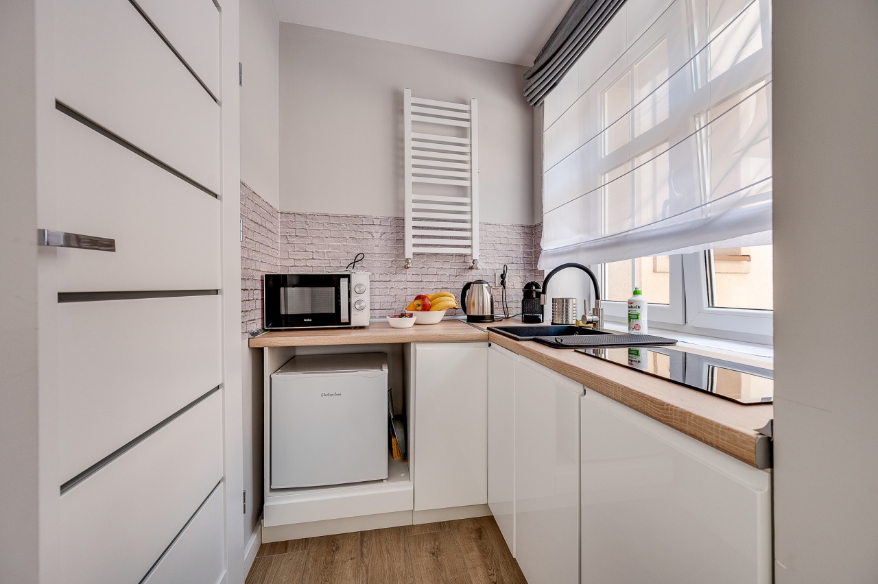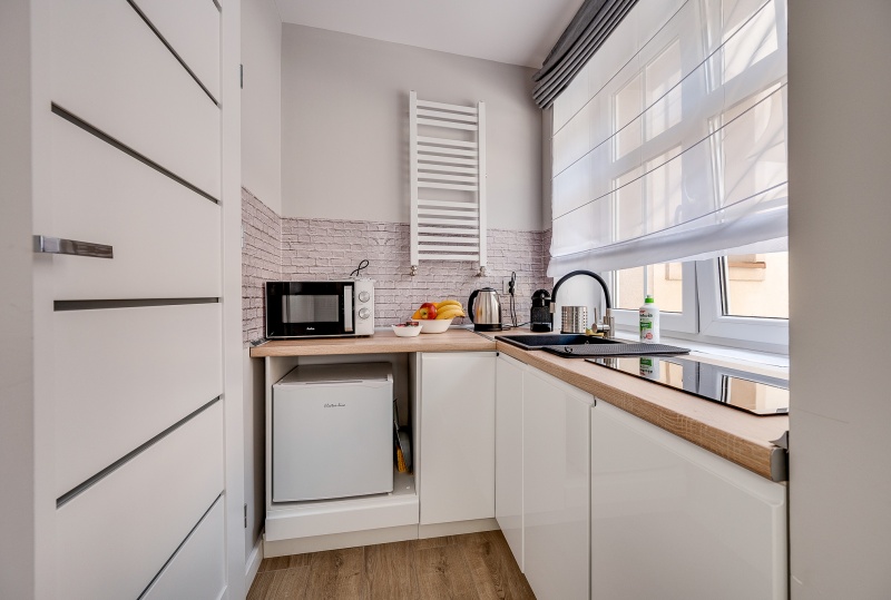 Ten niewielki apartament będzie idealnym miejscem pobytu dla 2 osób. Apartament to wygodna otwarta przestrzeń, w której znajdziemy aneks kuchenny wyposażony w czajnik, kuchenkę mikrofalową, płytę grzewczą i lodówkę, dwa łóżka pojedyncze oraz dużą szafę. Apartament posiada również prywatną łazienkę wyposażoną w pralkę. Do dyspozycji dla Naszych gości przygotowaliśmy komplet ręczników oraz smaczną kawę na czas pobytu