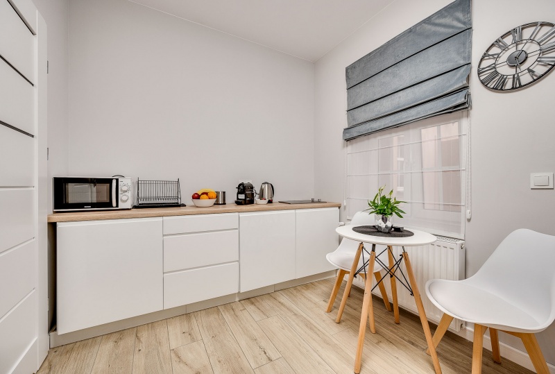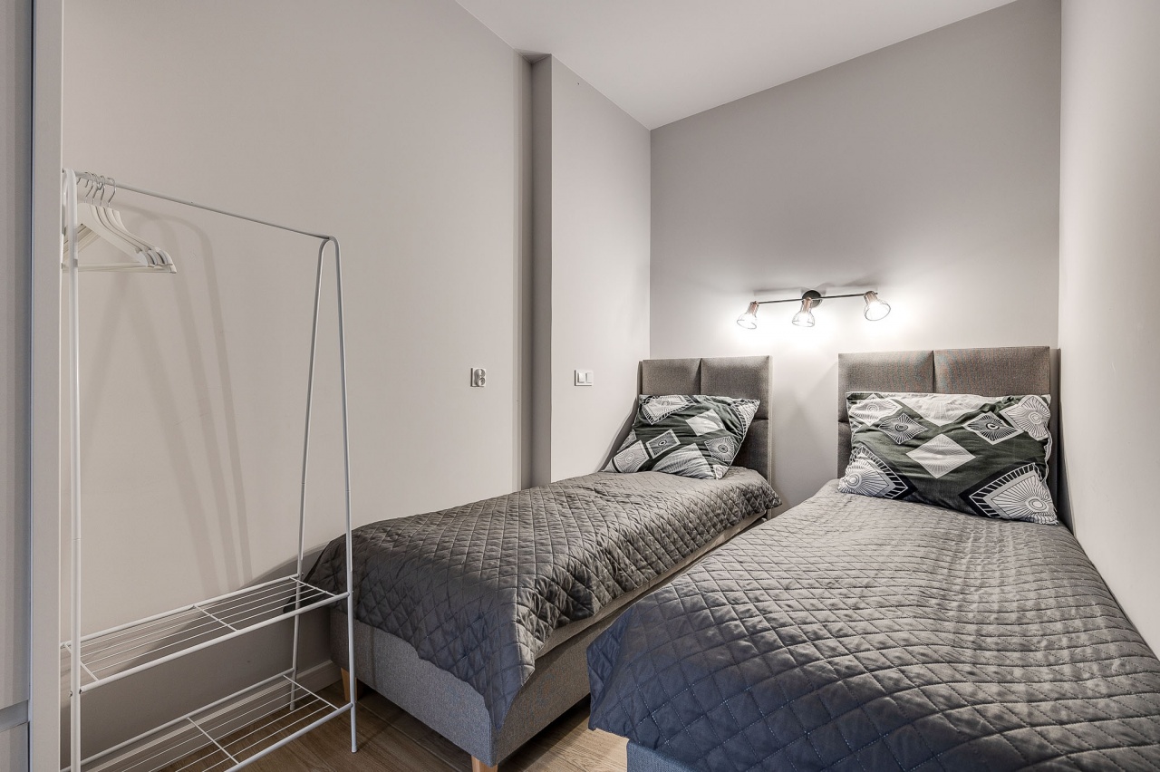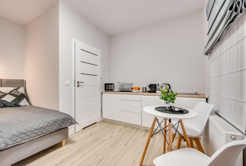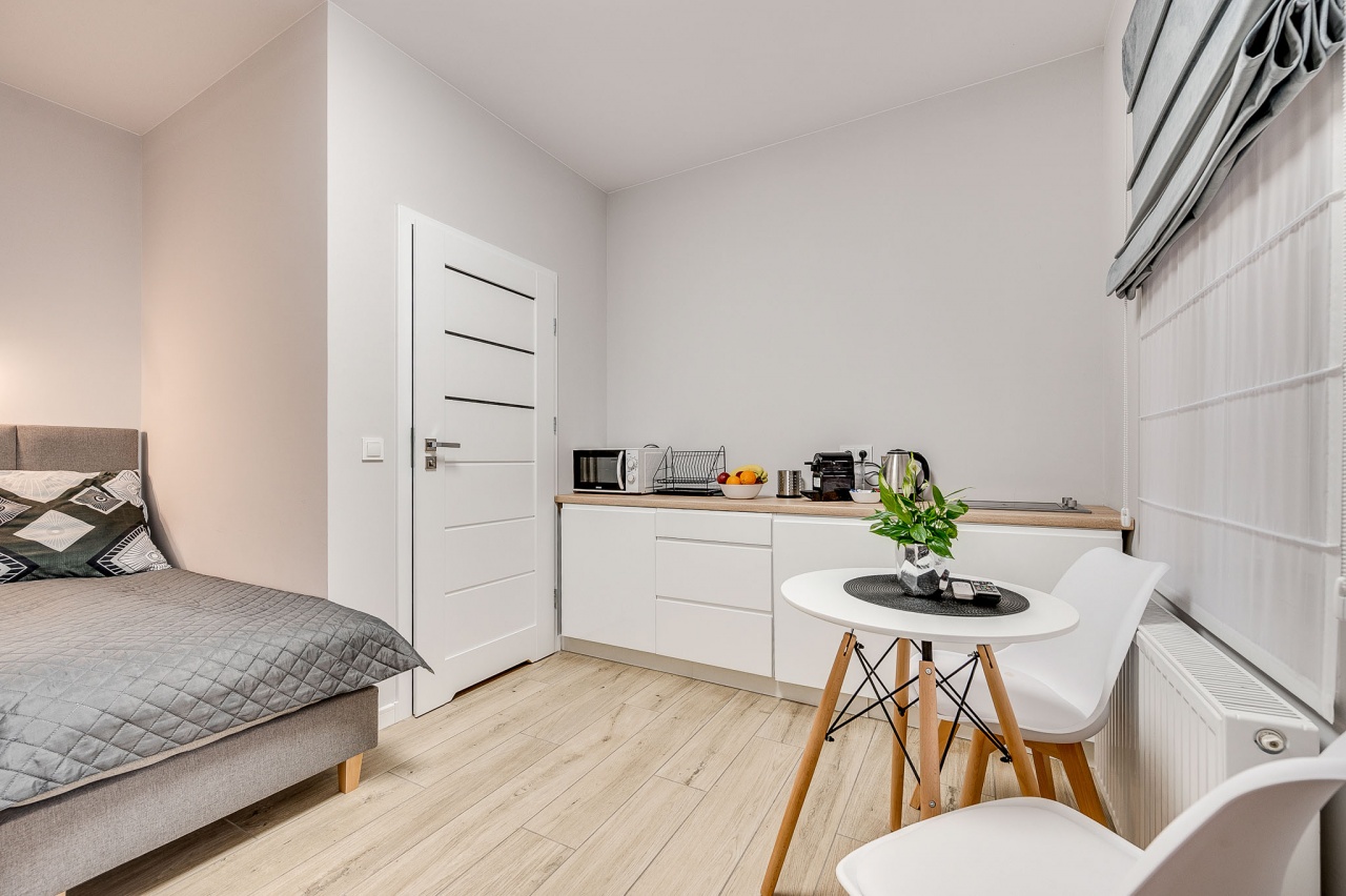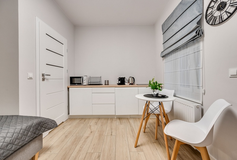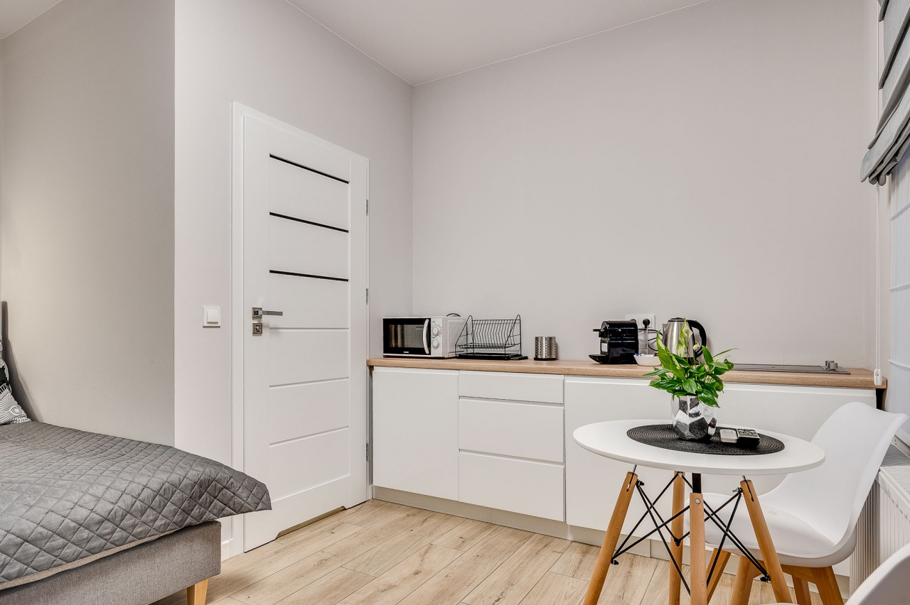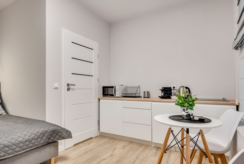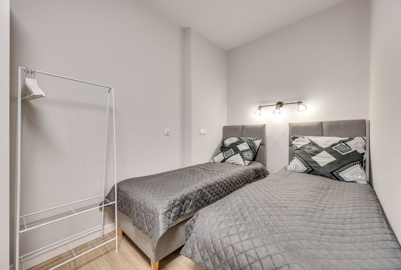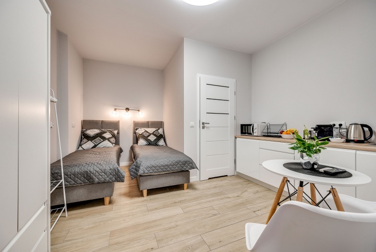 To niewielkie studio będzie idealnym miejscem pobytu dla 2 osób. Apartament to wygodna otwarta przestrzeń, w której znajdziemy aneks kuchenny wyposażony w czajnik, kuchenkę mikrofalową, płytę grzewczą i lodówkę, dwa łóżka pojedyncze oraz dużą szafę. Apartament posiada również prywatną łazienkę.