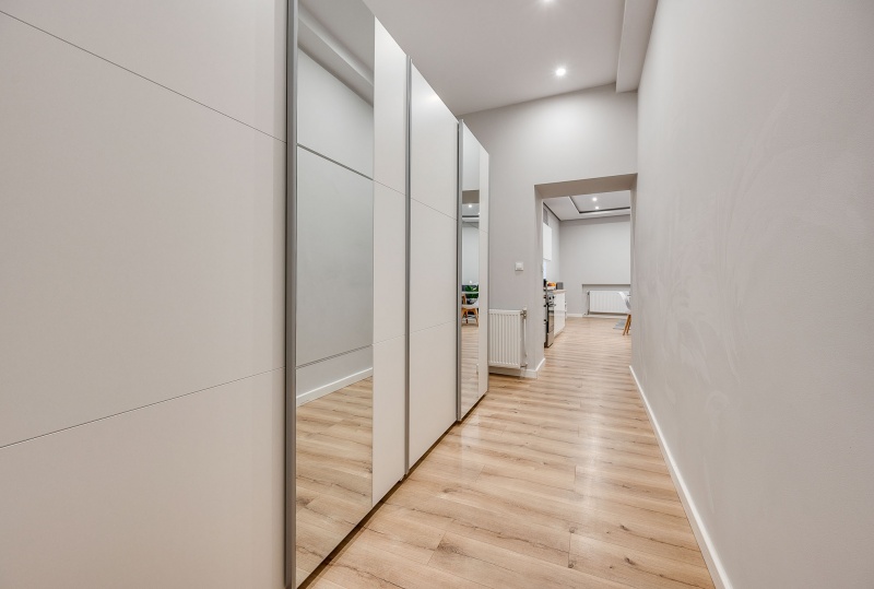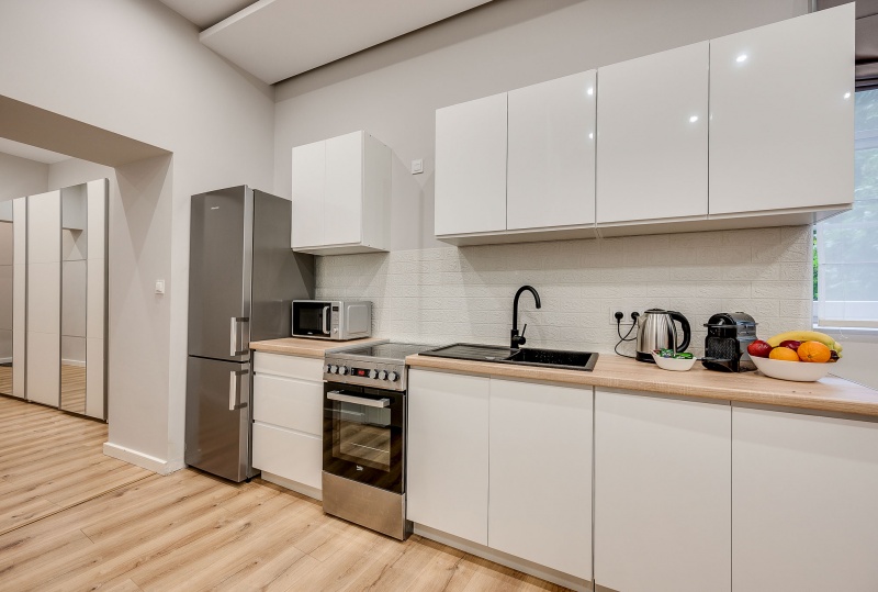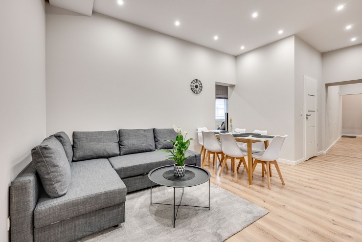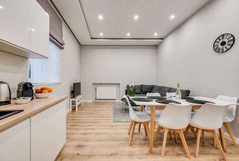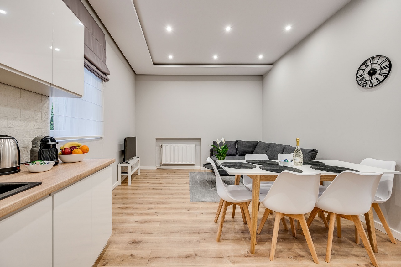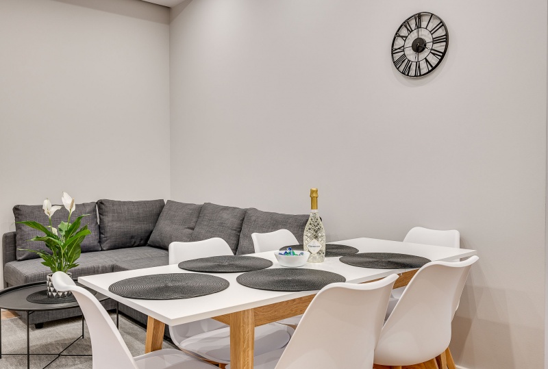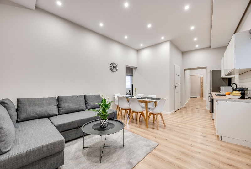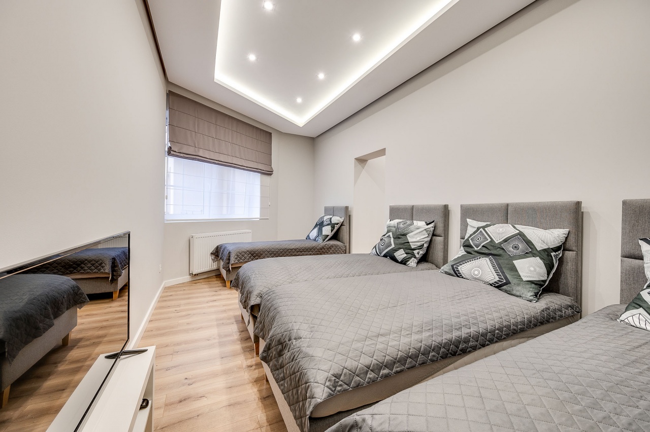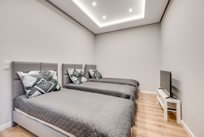Ten sporych rozmiarów apartament składa się z dużego salonu połączonego z w pełni wyposażonym aneksem kuchennym (czajnik, piekarnik z płytą grzewczą, kuchenka mikrofalowa, duża lodówka) oraz częścią jadalnianą ze stołem dla 6 osób. Znajduje się tam również rozkładana sofa dla 2 osób. W korytarzu znajdziemy dwie przestronne szafy, a w sypialni 4 łóżka pojedyncze oraz dodatkowy telewizor.