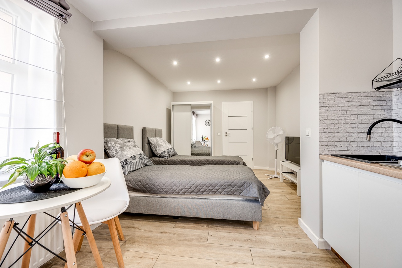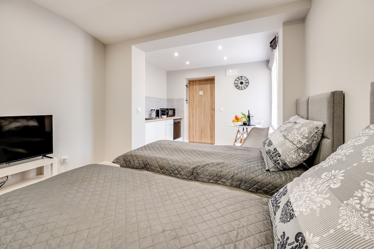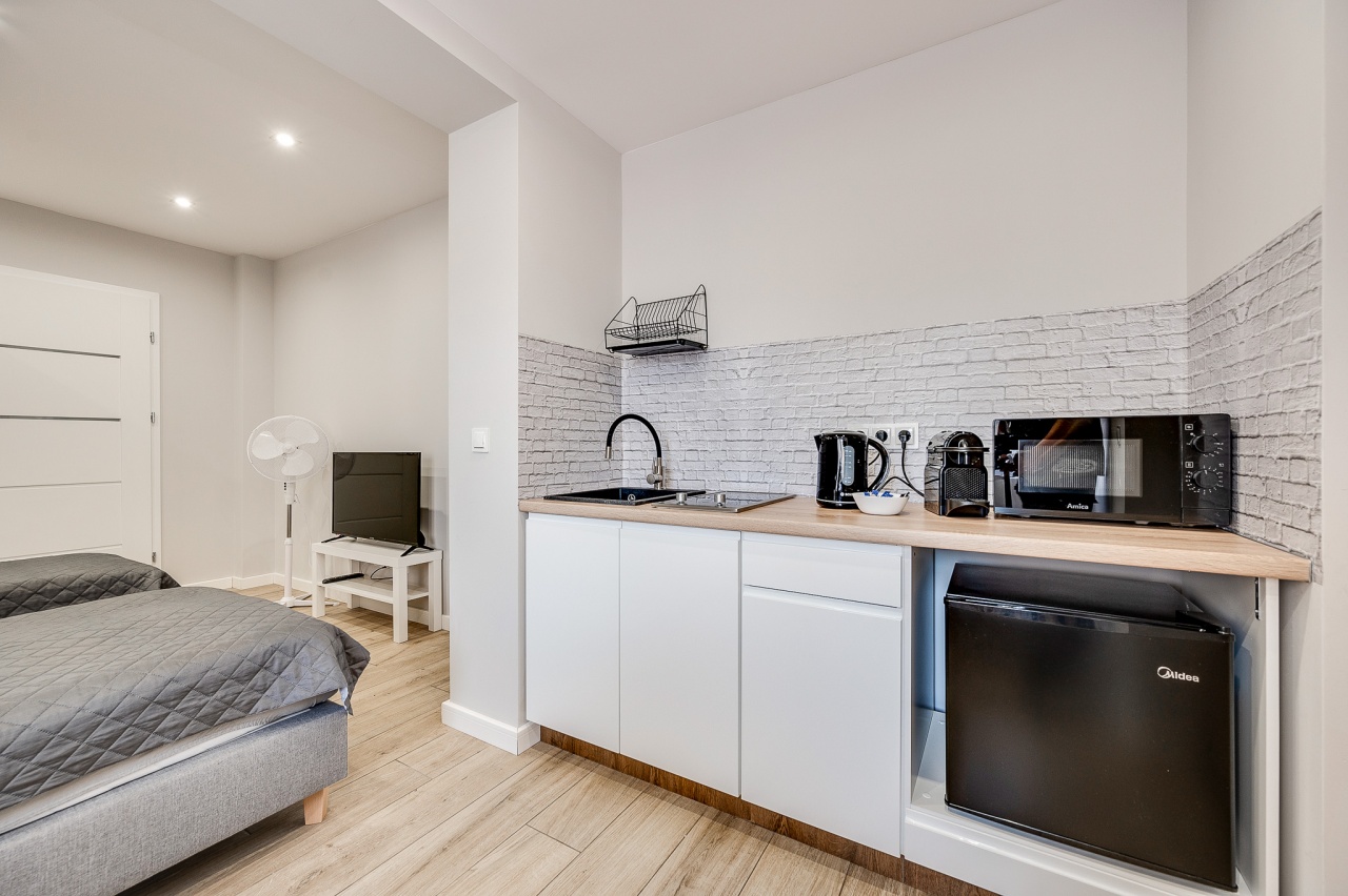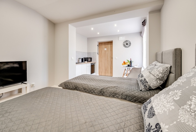 Ten niewielki apartament będzie idealnym miejscem pobytu dla 2 osób. Apartament to wygodna otwarta przestrzeń, w której znajdziemy aneks kuchenny wyposażony w czajnik, kuchenkę mikrofalową, płytę grzewczą i lodówkę, dwa łóżka pojedyncze oraz dużą szafę. Apartament posiada również prywatną łazienkę wyposażoną w pralkę. Do dyspozycji dla  Naszych gości przygotowaliśmy komplet ręczników oraz smaczną kawę na czas pobytu