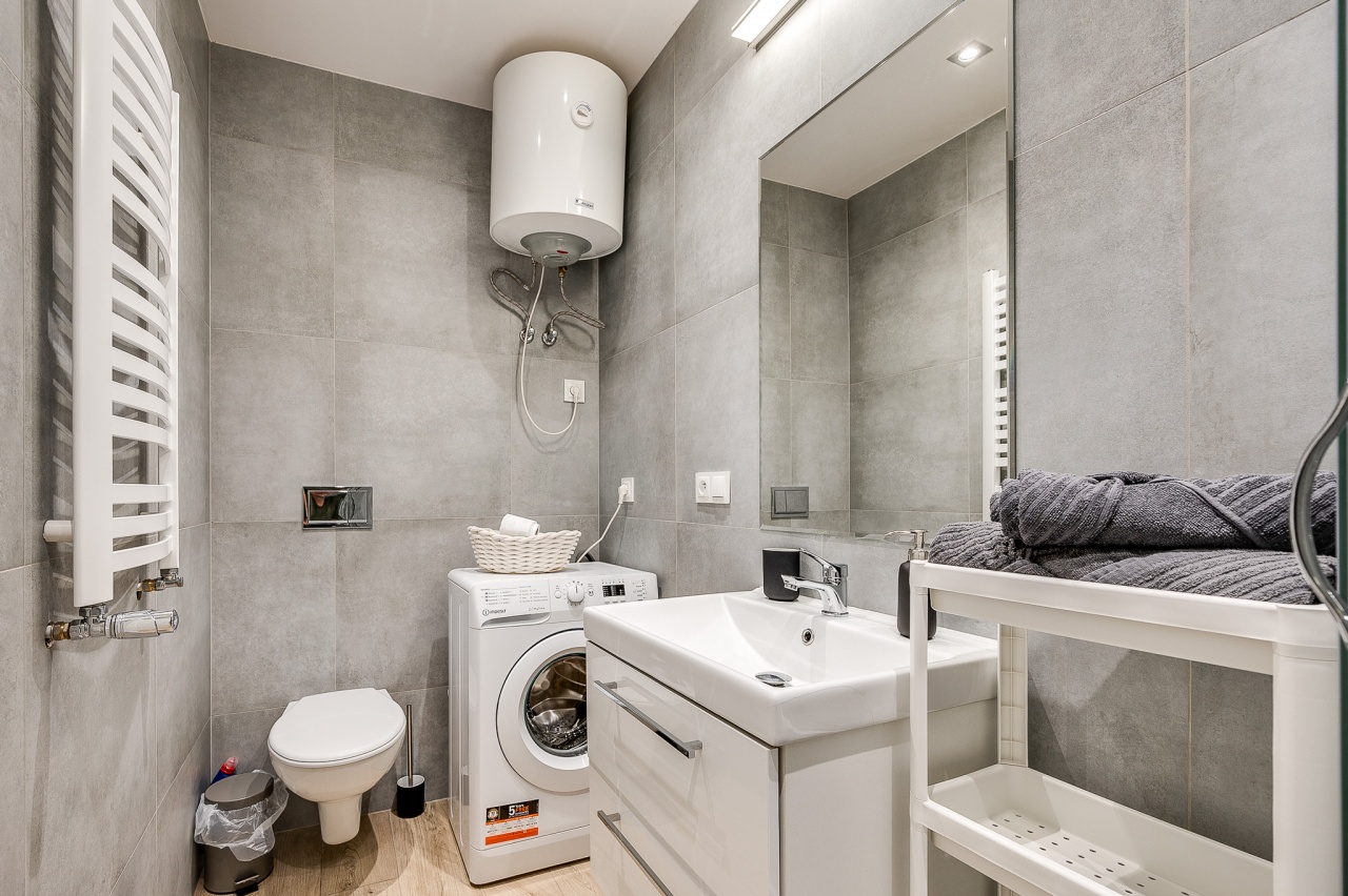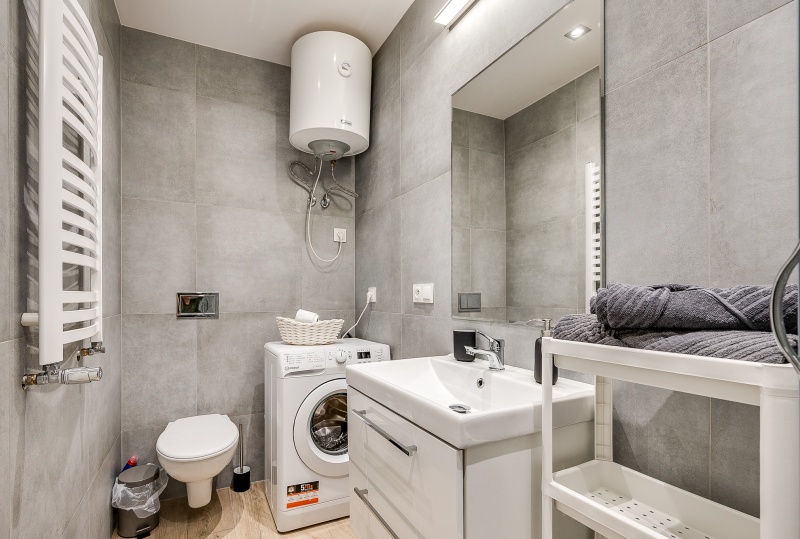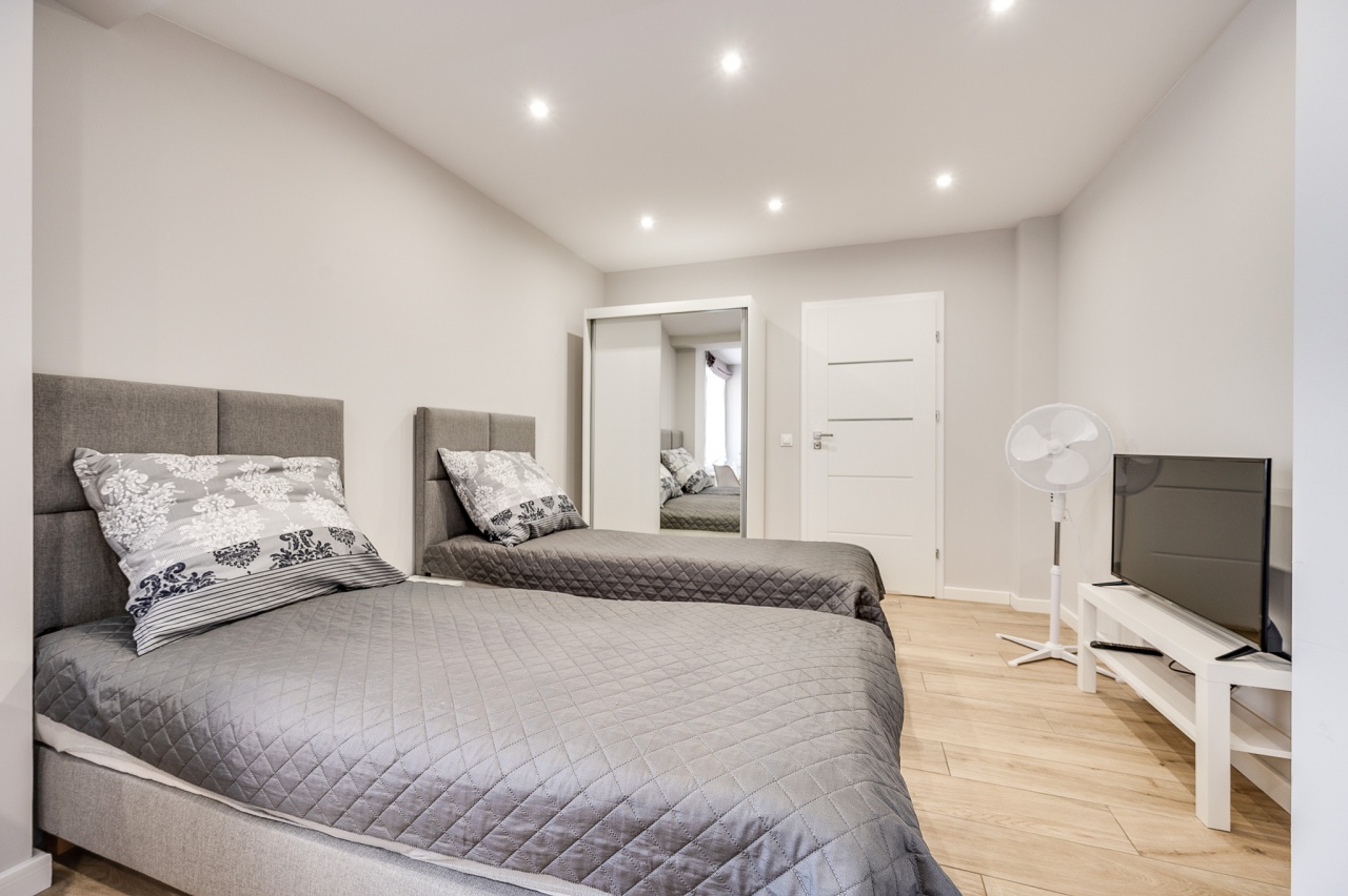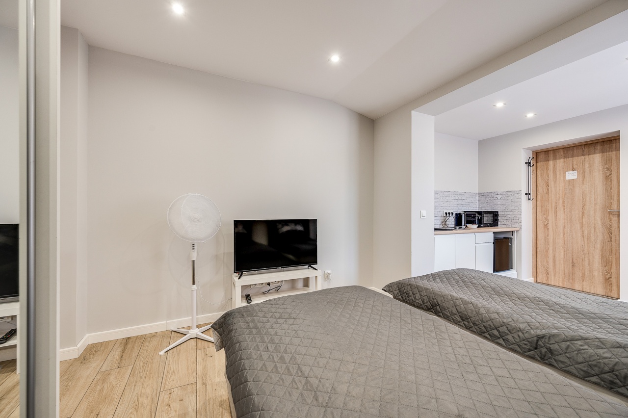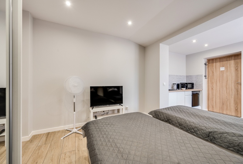 Ten niewielki apartament będzie idealnym miejscem pobytu dla 2 osób. Apartament to wygodna otwarta przestrzeń, w której znajdziemy aneks kuchenny wyposażony w czajnik, kuchenkę mikrofalową, płytę grzewczą i lodówkę, dwa łóżka pojedyncze oraz dużą szafę. Apartament posiada również prywatną łazienkę wyposażoną w pralkę. Do dyspozycji dla  Naszych gości przygotowaliśmy komplet ręczników oraz smaczną kawę na czas pobytu