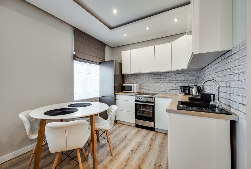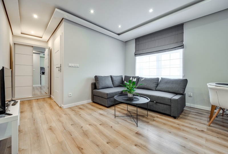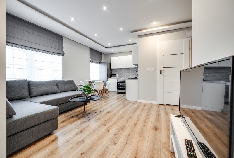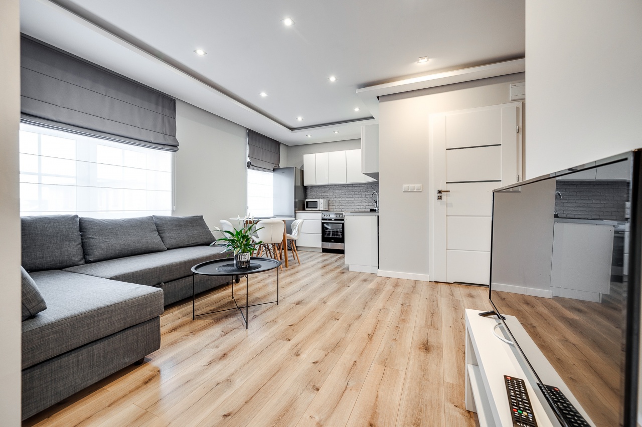 Ten komfortowy apartament posiada salon z rozkładaną sofą dla 2 osób, stolik kawowy, aneks kuchenny, stół obiadowy z krzesłami , TV oraz przestronną szafą.